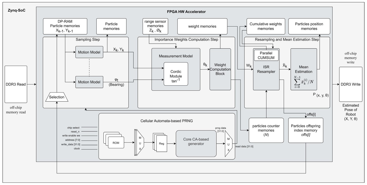 Developed a real-time FPGA-based particle filter SLAM accelerator for mobile robot navigation. The implementation achieved significant speedup compared to CPU-based solutions while maintaining accuracy for indoor localization and pose estimation.